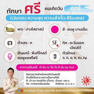 คำว่า #ศรี ในวิชาทางหลักทักษานั้น หมายถึง การเงินการทอง , ความสงบสุข , ความสำเร็จ, ความเป็นสิริมงคล ซึ่งจะบรรจุไว้แตกต่างกันสำหรับกรณีที่เกิดในวันต่างๆ ในที่นี้จะขออธิบายสำหรับท่านที่ #เกิดวันศุกร์ โดยจะนับตั้งแต่หลังพระอาทิตย์ขึ้นแล้ว บางท่านเกิดวันเสาร์กลางคืน ตอนตี ๕ กว่า ๆ ให้นับว่าท่านเป็นคนเกิดวันเสาร์ จะนำ #เคล็ดลับ นี้ไปใช้กับท่าน หามิได้ จึงขอแจ้งให้ทราบก่อนเพื่อป้องกันการสับสนในการนำไปใช้