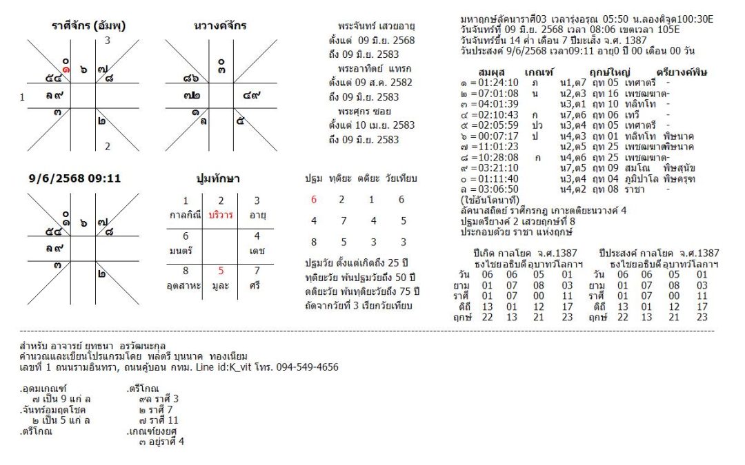 วันที่ 9 มิถุนายน 2568 (ขึ้น 14 ค่ำ เดือน 7 ปีมะเส็ง จ.ศ. 1387) : “ลัคนาราศีกรกฎ เสวยราชาฤกษ์”และเป็น“มหาฤกษ์” ⸻ 1. บริบททางปฏิทินและโหราศาสตร์ • พุทธศักราช (พ.ศ.): 2568 • จุลศักราช (จ.ศ.): 1387 • วันจันทร์ที่ 9 มิถุนายน 2568 • คำทำนายตามปฏิทินจันทรคติ: ขึ้น 14 ค่ำ...